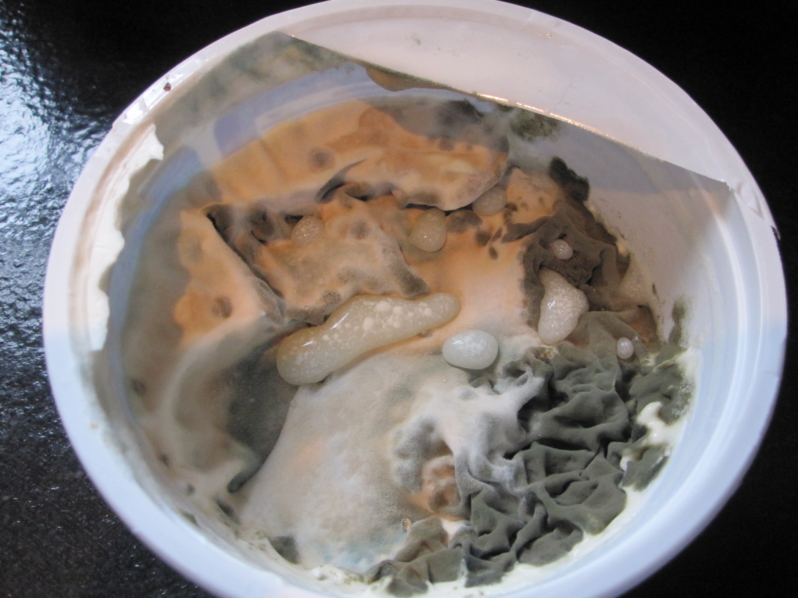 example of sour cream that has been lost for a while. I gladly chunked it in the trash. (OK, My decaying food is not very interesting, but check out Klaus Pichler's photography of food waste created to make a statement about the fact that one-third of food is wasted: http://www.npr.org/blogs/ thesalt/2012/04/14/150494837/ revealing-the-revolting- beauty-of-food-waste?sc=ipad& f=1008